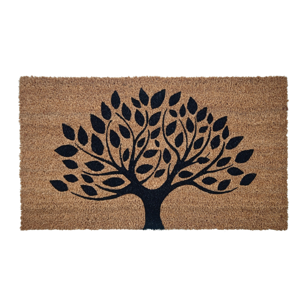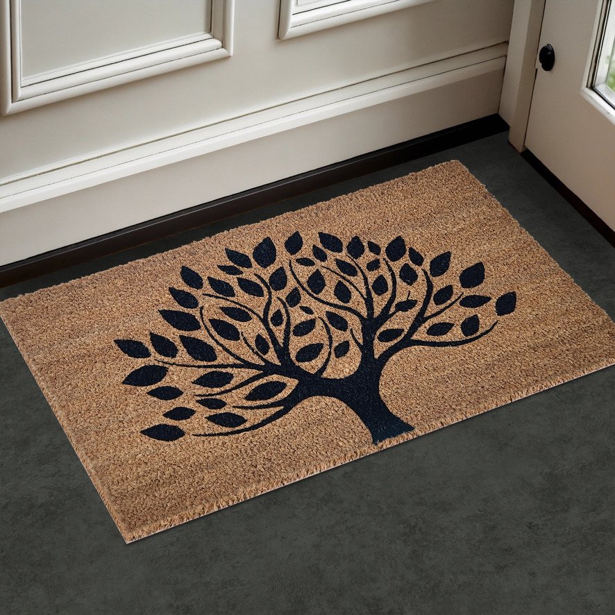 The Tree of Life coir doormat brings a bold, nature‑inspired elegance to your entrance with its striking tree silhouette and detailed leaf design. Crafted from durable natural coir fibres and supported by a strong latex backing, this 70 × 40 cm doormat effectively scrapes dirt while staying securely in place. Its timeless botanical artwork makes it ideal for front doors, porches, hallways, and flats, offering a stylish and practical way to welcome guests into your home.